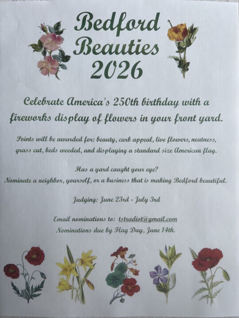 Bedford Beauties, a contest judging the curb appeal of local front yards, has been sponsored by The Bedford Garden Club since 2011. Nominations for 2026 will be accepted until June 14. Email yours to tstradiot@gmail.com. Judges will visit neighborhoods June 23 – July 3 to select honorees, who enjoy a Bedford Beauties sign in their yard for a month, as well as bragging rights.