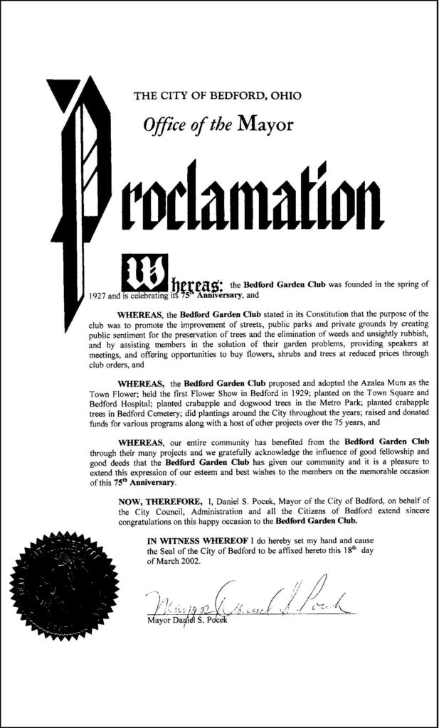 The celebrations continue. In March, Mayor Dan Pocek presented the Club with an official proclamation by the City Of Bedford recognizing 75 years of service to the Community.