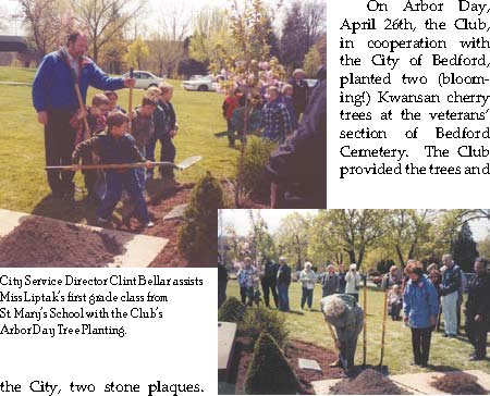 On Arbor Day, April 26th, the Club, in cooperation with the City of Bedford, planted two (blooming!) Kwansan cherry trees at the veterans’ section of Bedford Cemetery. The Club provided the trees and President Joyce Daunch starts the first shovel of dirt for the April 2002 Arbor Day Tree Planting in the Veteran’s section pf Bedford Cemetery, while Ethel