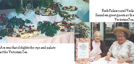 Bringing their own chinaware tea cups, club members attended a catered Victorian Garden Tea, April, 2002, celebrating the Club’s Diamond Jubilee. Greeters, Ruth Falasco, Viola Saunders, Mary Lou Collins, Barbara McDaniel, and Joyce Daunch seated guests in the Orchid Room of Petitti Ruth Falasco and Viola Saunders greet guests at the Victorian Tea.